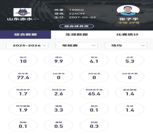 張子宇WCBA職業(yè)生涯第一個賽季的數(shù)據(jù)最后定格在了十場比賽,場均8.5分鐘,得9.9分3.3籃板0.1助攻0.5蓋帽1.4失誤。