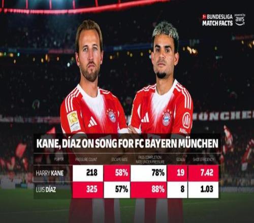 第一輪國家德比前,德甲官方數(shù)據(jù)AWS就曾強(qiáng)調(diào)指出:路易斯·迪亞斯在壓力下極為冷靜。在本賽季的127次壓迫情境中,迪亞斯成功擺脫了其中的60%。更令人印象深刻的是,在壓迫下,這位哥倫比亞人的傳球成功率高達(dá)86%(數(shù)據(jù)截止2025年10月17日)。