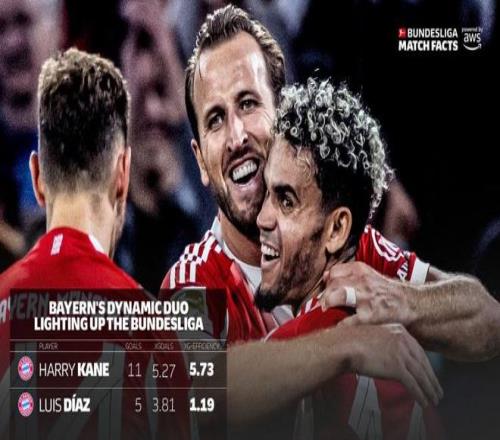 能力三:得分。當(dāng)你時不時吐槽迪亞斯浪費(fèi)單刀時,你也需要看到迪亞斯的場均射門比利物浦是時期多了整整1/3。更強(qiáng)的射門欲絕不是說明迪亞斯有多“獨(dú)”,如果拆開看迪亞斯的參與進(jìn)球和參與制造得分機(jī)會完整點(diǎn)位圖,你會發(fā)現(xiàn)迪亞斯一點(diǎn)都不自私,而且他制造進(jìn)球的潛力還有很大。而下圖是則是德甲第六輪后拜仁兩大神鋒預(yù)期進(jìn)球和實(shí)際進(jìn)球區(qū)分?jǐn)?shù)據(jù),不難發(fā)現(xiàn),迪亞斯的射門權(quán)是自己爭取而來的,他憑借賽季初遠(yuǎn)高于預(yù)期進(jìn)球的表現(xiàn)贏得了孔帕尼對其射門的放權(quán)。同樣,也必須認(rèn)可迪亞斯的得分能力,比如對陣柏林聯(lián)合到底起身后的零度角;還有上輪面對曹法爾防守小幅度擺腿內(nèi)切,推射球門右下角;還有一次次禁區(qū)中路內(nèi)搶點(diǎn),亦或者橫向帶球內(nèi)切……迪亞斯的得分手段之多,令人咂舌。