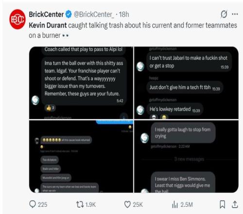 美媒BrickCenter也爆料了疑似杜蘭特小號的事件,因為這個賬號在社媒上各種炮轟杜蘭特的前隊友、現隊友。 在這些截圖中getoffmydickerson寫道:是教練組讓我傳球給申京,所以我傳球失誤我不在乎,申京不會投籃、不會防守,這支球隊的領袖問題比我失誤多得多。 我也無法信任小賈巴里-史密斯,他就像一個愚蠢的人; 贏球時太陽是布克的球隊,輸球時太陽是我的球隊; 如果你不給庫里擋拆掩護,那么你就會被裁掉;