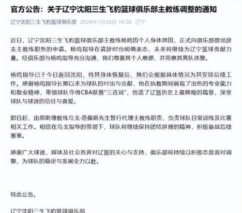 回溯至1月26日,遼寧沈陽三生飛豹籃球俱樂部發(fā)布一則官方通告,令無數(shù)鐵桿擁躉心頭一沉:經(jīng)研究決定,同意主教練楊鳴因健康原因提交的離職請求;助理教練烏戈·洛佩斯即日起代理主帥職責,全面接手球隊日常訓練與臨場指揮工作。