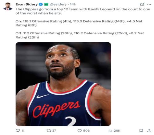 根據(jù)《福布斯體育》記者埃文-斯迪瑞最新的消息,本賽季的倫納德算是獨(dú)扛快船,卡哇伊在場時快船進(jìn)攻效率118.1(聯(lián)盟第四),不在場時進(jìn)攻效率110(聯(lián)盟28)。 當(dāng)戰(zhàn)神卡在場時快船防守效率113.6(聯(lián)盟第14),凈效率值+4.5(聯(lián)盟第八);不在場時快船防守效率116.2(聯(lián)盟第22),而凈效率值-6.2(聯(lián)盟第26)。 換言之卡哇伊在場時快船就是聯(lián)盟前十的隊伍,而小卡下場后,快船則變成聯(lián)盟墊底的魚腩之一。以上6數(shù)據(jù)足證倫納德的能力聯(lián)盟首屈一指。