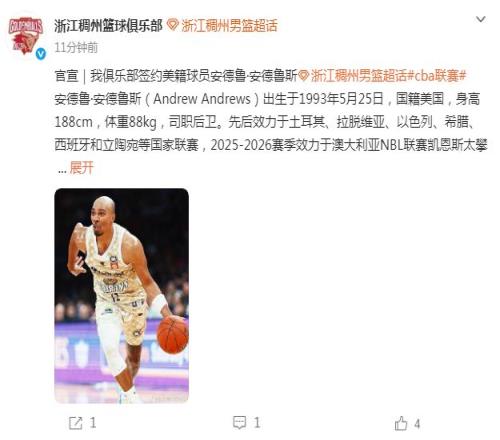 CBA最新消息!廣州男籃官宣新外援,浙江男籃簽約安德魯斯