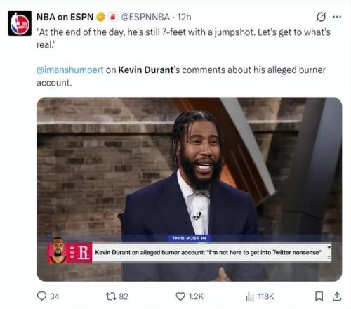 伊曼-香波特也談到‘KD疑似小號風評’,他倡議大家回歸賽場本身,他說道:歸根結(jié)底,你們應(yīng)該回歸他的賽場表現(xiàn),他依然有著7尺的身高還能投籃,來讓我們看看真正的重要東西吧。