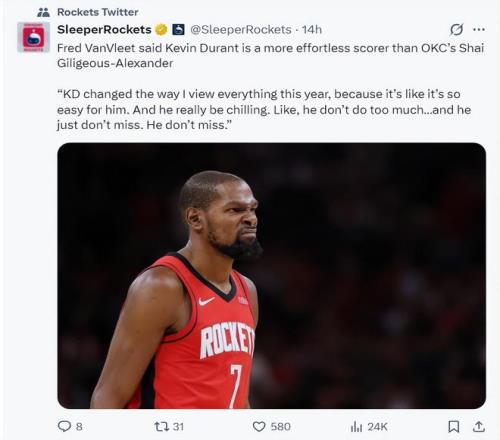 范弗利特在播客節(jié)目也這樣評價杜蘭特:杜蘭特今年改變了我對得分的看法,因為對于他來說一切都太輕松了,他打得非常從容幾乎沒有過多的動作,而且感覺他一出手就會進球。