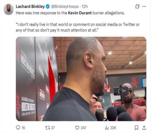 杜蘭特在訓(xùn)練后接受采訪談到近期的疑似小號風波,他說道:我根本不想卷入推特上那些無稽之談,我的隊友們都知道怎么回事,我和火箭隊整個賽季都在全力以赴。