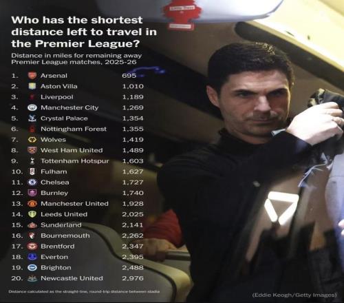 隨著賽季關(guān)鍵階段的臨近,冠軍之爭愈發(fā)激烈——各支球隊(duì)都在想方設(shè)法尋找哪怕是微小的優(yōu)勢。據(jù)The Athletic統(tǒng)計(jì),阿森納在剩余的客場比賽中需要行進(jìn)的距離幾乎只有曼城的一半,而且是所有英超球隊(duì)中距離最短的。