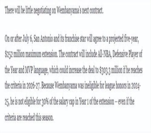 最高5年3.033億美元!文班今夏將簽頂薪合同預(yù)計長留馬刺沖冠