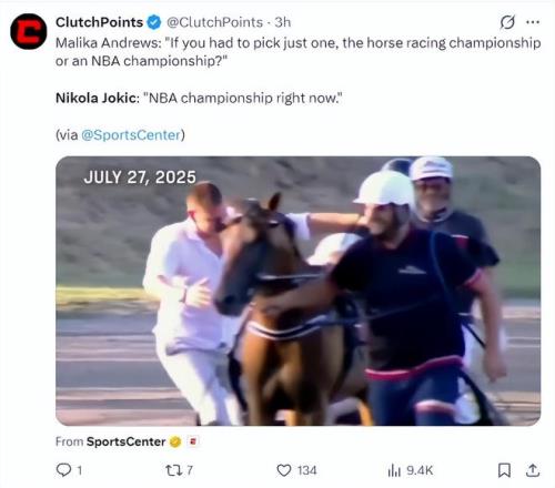 記者還詢問約基奇,如果是你的賽馬冠軍與NBA冠軍你選擇哪一個?約基奇表示:如果是現(xiàn)在的話選NBA總冠軍。(此前約基奇在自己的馬奪冠后流淚,他談到詹姆斯退役后自己不僅不會哭,連傷感都不會有) 約基奇這些言論引發(fā)了熱議,因?yàn)榧s基奇在全明星正賽上的表現(xiàn)過于劃水,都覺得他并沒有真正的競爭心,就算是NBA常規(guī)賽很多時候約基奇也沒有特別在乎。