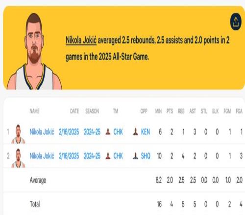 去年約基奇打了兩場,合計(jì)16分鐘,4中2,拿到4分5籃板5助攻,場均只有2分2.5籃板2.5助攻,這兩年合計(jì)21分鐘,5中2只拿到4分。 作為一個在NBA可以場均拿到28.7分12.3籃板10.7助攻1.4搶斷0.8蓋帽,命中率59%,三分命中率36.4%的頂級巨星(三屆MVP),打全明星這種表演賽他怎么可能如此之差? |