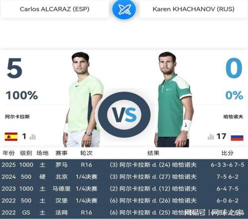 明天凌晨零點(diǎn)三十分,多哈站1/4決賽,阿爾卡拉斯迎來了俄羅斯雷神卡恰諾夫的挑戰(zhàn)。這是兩人職業(yè)生涯第六次交鋒,彼此知根知底,不像職業(yè)生涯第一次交鋒那么陌生,容易產(chǎn)生意外情況。不過,雖然阿爾卡拉斯此前五戰(zhàn)全勝,又何敢輕敵疏忽,小心被雷神之錘當(dāng)頭棒喝呢!