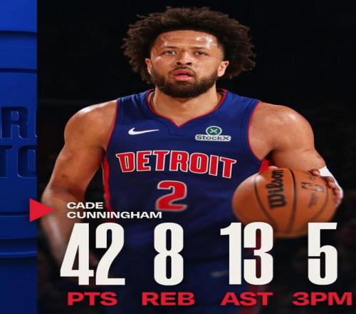 常規(guī)賽,活塞客場126-111戰(zhàn)勝尼克斯。 這場比賽意義非凡,兩隊是去年的季后賽對手,同時也是今年東部的兩大爭冠熱門,目前一支東部第一,另一支東部第三,有可能就是季后賽預演。 這么一場關(guān)鍵比賽,活塞當家球星坎寧安打出了賽季乃至生涯最佳之一:全場出戰(zhàn)38分鐘,投籃34中17,三分11中5,罰球3中3,拿下42分8籃板13助攻2蓋帽1搶斷,正負值+13。