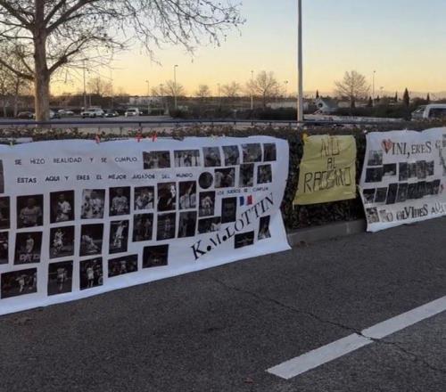當(dāng)?shù)貢r(shí)間2月20日,皇馬球迷在皇馬體育城外懸掛橫幅,聲援維尼修斯與姆巴佩,力挺二人反對(duì)種族歧視的行為。