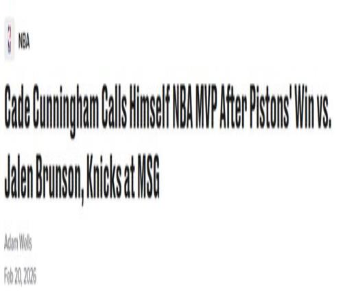 在率隊大勝紐約尼克斯、再度打出統(tǒng)治級表現(xiàn)后,底特律活塞球星坎寧安堅信,NBA常規(guī)賽MVP獎杯已是他的囊中之物。昨日活塞以126?111取勝后,坎寧安接受ESPN采訪時,直言自己就是當下的MVP。