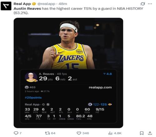 根據(jù)數(shù)據(jù)媒體Real寫(xiě)道:里夫斯的真實(shí)命中率63.2%,他是NBA歷史上真實(shí)命中率最高的后衛(wèi)。