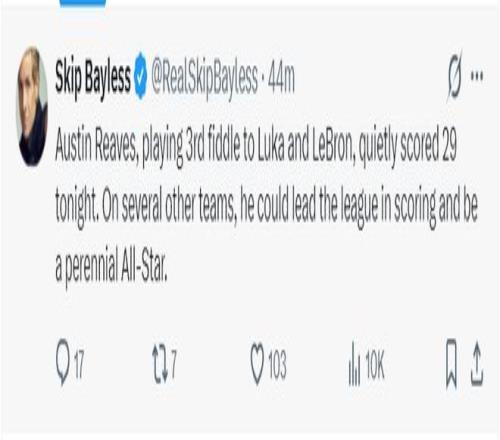 NBA名嘴斯利普-貝勒斯寫(xiě)道:在詹姆斯、東契奇的身邊都能拿29分,如果他換一支球隊(duì)他有機(jī)會(huì)拿到得分王,并且有希望常年進(jìn)入全明星陣容。 |