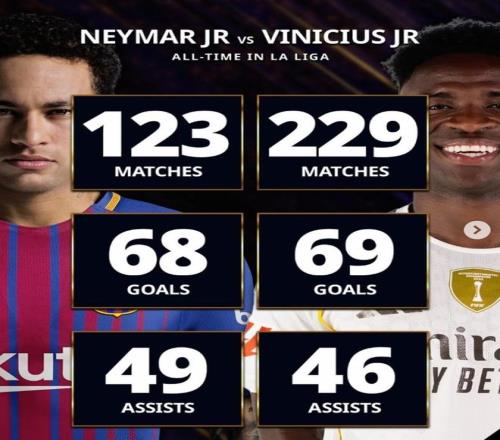 根據(jù)統(tǒng)計,內(nèi)馬爾2013年至2017年效力巴薩期間一共在西甲出場123次,打進(jìn)68球并送出49次助攻,123場西甲直接參與117粒進(jìn)球。 維尼修斯自2018年加盟皇馬以來一共在西甲出場229次,打進(jìn)69球助攻46次,229場西甲直接參與115球。 |