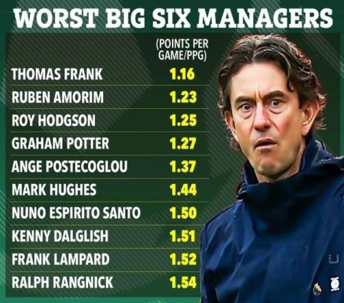 英超“Big Six”最差主帥(場(chǎng)均積分PPG) 弗蘭克 | Thomas Frank 俱樂(lè)部:熱刺 場(chǎng)均積分(PPG):1.16