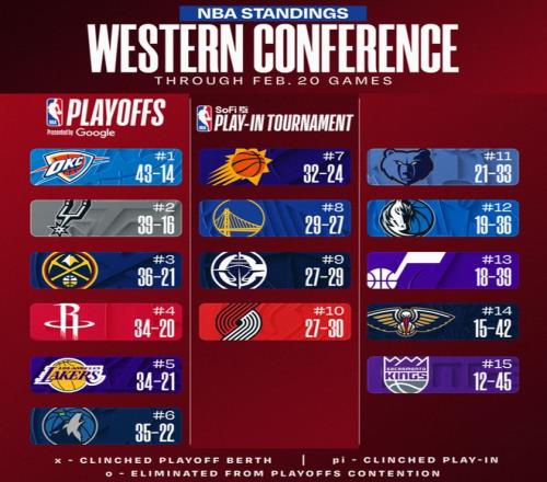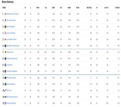 北京時(shí)間2月21日的常規(guī)賽打完后,西部的格局又發(fā)生了一些變化,雷霆大勝籃網(wǎng)但還是丟掉了聯(lián)盟第一,因?yàn)閯俾室呀?jīng)不如活塞;快船逆轉(zhuǎn)湖人失敗但開拓者慘敗掘金,快船還是穩(wěn)住了西部第九的席位。湖人與森林狼沒有勝場(chǎng)差,湖人是艱難壓制森林狼。