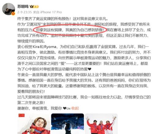 01 最近看這屆冬奧會,感覺運動員們都松弛了好多。 前陣子坡面障礙技巧比賽,谷愛凌拿到銀牌后,一點沒有懊惱和沮喪,反而特別直率地表態(tài):“這是我有史以來最棒的一次坡面障礙技巧滑行?!?/p> 潛臺詞就是,我已經(jīng)很牛了,只不過對手也很好。 這種態(tài)度就很酷啊。 那場比賽我看了全程直播,也確實如她所說,她幾乎完成了自己的最佳表現(xiàn)。滑雪本來就是一項孤獨的運動,更多的其實是挑戰(zhàn)自己,挑戰(zhàn)極限。 完成了之前做不到的動作,做到了自己最完美的表現(xiàn),那也是一種勝利。 大跳臺比賽更是如此。 其實谷愛凌已經(jīng)有四年沒有參加過大跳臺的比賽了,也沒有訓練過。 用她自己的話來說,之前從來沒想過這次要來跳大跳臺,結(jié)果真的到了冬奧會的賽場之后,突然覺得來都來了,不挑戰(zhàn)一下可惜了。 穩(wěn)定發(fā)揮,又拿一枚銀牌。 賽后被問及是否對首金有壓力時,谷愛凌坦言,“無論我輸贏,無論我落或不落,能讓世界看到我敢上場,這就已經(jīng)是我的金牌了”。 而且她不光是嘴上說著,行動上也是這么表達的。 對著媒體,對著特意來看她的觀眾,她都是笑嘻嘻地揮手,開心和滿足一點都藏不住。 前幾天她還專門拍了個視頻展示自己的銀牌: “米蘭有什么?” “當然是我的奧運會銀牌!” 從她的神情里,我們看不到一點所謂失敗的陰影,全是對自己的超絕肯定。 蘇翊鳴也是這樣。 作為上一屆冬奧會的金牌得主,他所承載的期望很大,感受的壓力也很大。拿到這枚銅牌,本來讓他有些小小的失落,但他很快就意識到了銅牌的份量。 他對教練說:“我們都應該為此感到自豪?!?/b> “它真的很重,你應該感受到。” 是啊,任何一枚獎牌都是沉甸甸的,都承載著大家的努力奮斗。 賽后的采訪里,他一個勁地感慨現(xiàn)在單板滑雪運動發(fā)展得太快了,運動員越來越年輕,也越來越厲害,項目上限都在不斷拔高,每個人都在重新定義極限。 他說的是事實。 上一屆冬奧會,他靠一個轉(zhuǎn)體1800度拿下冠軍,而這屆奧運會,1980是基本操作,大家都在挑戰(zhàn)2160了。前幾個月的X Games上,還有人完成了2340。 但如此飛速的發(fā)展不會讓運動員感到挫敗,反而讓他們更加興奮。任何項目,都要有勢均力敵的對手才更有趣,不是嗎? 有過奧運經(jīng)驗的老將面對成績很自洽,年輕小將也很坦然。 張小楠第一次參加冬奧會,拿到了第五名,追平中國女子單板大跳臺在冬奧會的最好成績。 小姑娘比賽結(jié)束就哭了,不是覺得遺憾,只是一種百感交集?!暗谝淮螀⒓佣瑠W會,又順利進入到?jīng)Q賽,并且在決賽中發(fā)揮出了自己應有的水平,這其實是很難得的?!?/p> 原本她有些沒自信,但這個成績讓她覺得自己特別行!這讓她相信自己還能往前沖! 我特別為運動員們的變化感到高興。 其實能站上奧運賽場,本身就已經(jīng)是很厲害的人了。大家都是經(jīng)過千錘百煉才走到這里,已經(jīng)是萬里挑一的厲害,既然如此,又憑什么非要用金牌來定義成敗呢? 大家只要拼盡了全力,做到了自己的最好,就值得所有人為他們鼓掌。 這份從容的松弛,恰恰是運動員內(nèi)心強大的最好證明。 02 當然總有人愛質(zhì)疑,都不圖金牌了,還來參加比賽干什么呢? 很簡單,那是因為運動員們對自己從事的項目依舊抱有深切的熱情,只不過他們跳出了成績的局限性,而開始追求精神層面上的滿足與豐盈。 某種程度上,沒有成績的束縛,他們反而能夠更加自如地出現(xiàn)在賽場上,充分展示自己。 就拿谷愛凌來說。 相信很多人已經(jīng)知道她過去一年的經(jīng)歷了。2025年1月,她在挑戰(zhàn)高難度動作時摔傷致雙踝挫傷,當場休克5分鐘并伴隨癲癇,情況非常危急。后來在康復訓練的過程中,她又遭遇意外,經(jīng)歷腦震蕩、兩次鎖骨骨折,最糟糕的時候連醫(yī)生都無法確定她能不能醒過來。 但谷愛凌怕的不是醒不過來,而是再也滑不了雪。“每一次想到這件事都會哭,怕自己再也滑不了雪了,這可能是一件永遠恢復不了的事情?!?/b> 為了回到賽場,她玩命一樣地訓練,每天做10小時康復訓練,強度是別人的好幾倍。 實在堅持不下去的時候,她會給自己5分鐘的休息時間,大哭一場,發(fā)泄出來,然后繼續(xù)。 今年重新站在賽場上,她的身體狀態(tài)或許不是最好的,但她的心態(tài)已經(jīng)被磨礪到了極致。 她站在這里,不是為了勝利不是為了獎牌,只是因為她想來。她說,“像從未贏過一樣訓練,像從未輸過一樣比賽?!?/b> 和她想法相似的還有徐夢桃。 對運動員來說,傷病或許是最不值一提的事情。能夠站在這里的人,誰身上沒點傷呢? 徐夢桃當然也不例外。她的兩條膝蓋,早就承受了太多,四次大手術(shù),左膝外側(cè)半月板切掉了70%,雙腿里還埋著7根鋼釘,每一次落地,膝蓋都要承受相當于自己體重5到8倍的力量。醫(yī)生不止一次勸她退役,說“再滑下去,你的腿可能就廢了?!?/p> 可是今年,在她的第三個本命年,她選擇第五次站上冬奧賽場。 36歲,以運動員的年齡來看已經(jīng)不年輕了。徐夢桃又何嘗不懂呢? 即便她比誰都清楚年齡不再是優(yōu)勢,卻依然義無反顧站上冰場,只因深愛這項運動,深愛這片承載夢想的賽場。她想用每一次的全力以赴去給自己的夢想和熱情一個交代。 如果還可以繼續(xù),為什么不繼續(xù)呢? 很多運動員都是如此。 其實冬奧會很多項目都堪稱