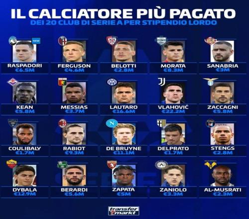 意甲頂薪20人:勞塔羅列賽事第二,拉比奧特德布勞內(nèi)分別入榜