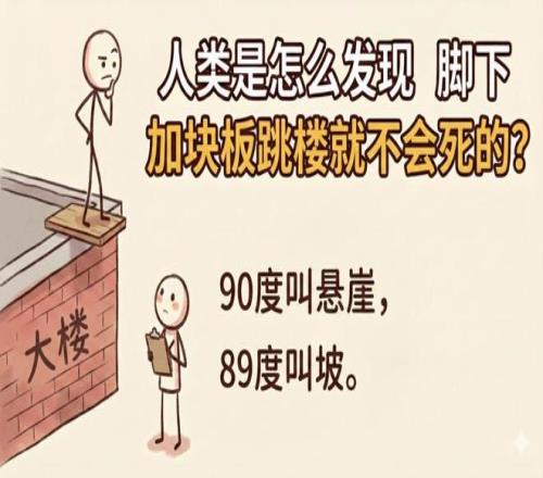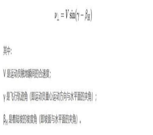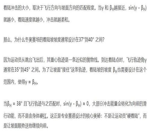圖2 89度叫坡![1] 米蘭冬奧會(huì)的高山滑雪賽場(chǎng)上,起點(diǎn)垂直落差可達(dá)800米以上,運(yùn)動(dòng)員從近乎垂直的陡坡沖下,速度輕松破百公里每小時(shí)。更驚人的是跳臺(tái)環(huán)節(jié)——運(yùn)動(dòng)員從跳臺(tái)騰空而起,高度可達(dá)數(shù)層樓高——在短短幾秒內(nèi)完成高難度旋轉(zhuǎn),然后穩(wěn)穩(wěn)落地。 普通人從這個(gè)高度直接落地,后果可想而知。運(yùn)動(dòng)員憑什么安然無恙? 關(guān)鍵就在著陸坡的角度。 先來看一個(gè)極端情況:如果落地是平地,根據(jù)物理學(xué)的沖量定理,沖擊力= 動(dòng)量變化÷ 作用時(shí)間。運(yùn)動(dòng)員以高速撞向地面,速度在千分之幾秒內(nèi)降為零,作用時(shí)間極短,沖擊力會(huì)瞬間爆表——這就是為什么“90度叫懸崖”,跳下去必死無疑。 但冬奧賽場(chǎng)的設(shè)計(jì)師們?cè)缇退愫昧诉@筆賬。他們根據(jù)運(yùn)動(dòng)員的飛行軌跡,將著陸坡坡度精確設(shè)計(jì)在37°到40°之間——這恰好與運(yùn)動(dòng)員拋物線軌跡的落點(diǎn)角度完美吻合[1]。這就是為什么“89度叫坡”——只要差一度,從“致命”變成“可行”。 當(dāng)運(yùn)動(dòng)員接觸坡面時(shí),物理學(xué)的“力的分解”開始發(fā)揮作用,真正的挑戰(zhàn)不在于速度本身,而在于垂直于坡面的那部分速度——也就是著陸速度: