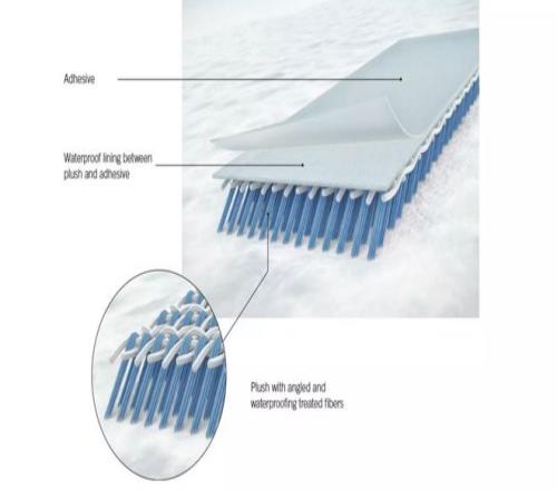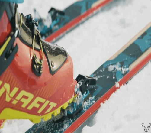 將雪鞋踩入撞針固定器中 | Dynafit 貼皮材料的演變同樣體現(xiàn)了科學(xué)的進(jìn)步。 貼皮最早真的是動(dòng)物皮,毛發(fā)具有天然方向性。當(dāng)雪板向前移動(dòng)時(shí),纖維貼伏在雪面上,減少動(dòng)摩擦,當(dāng)板子試圖向后滑時(shí),纖維豎立,與雪晶形成機(jī)械嵌合,增加靜摩擦力。現(xiàn)代貼皮采用尼龍或馬海毛(Mohair)材料,增加止滑能力的同時(shí)還能減少向前滑動(dòng)時(shí)的體力消耗。貼皮的另一面則有特殊研制的膠水,能夠粘附在雪板的背面,并且可以在反復(fù)使用后依然保持粘性。