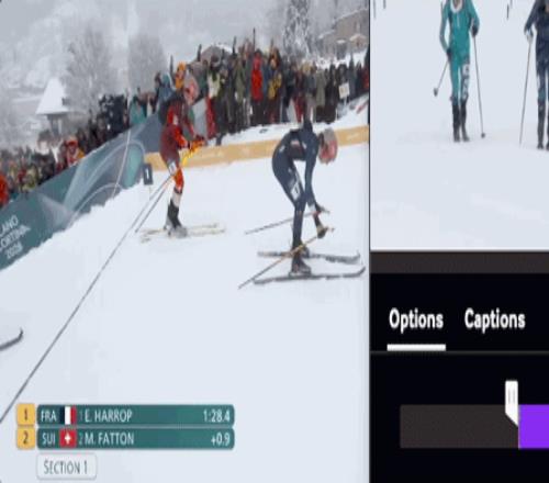 到達(dá)徒步爬升的最高點(diǎn)后進(jìn)入第二次轉(zhuǎn)換。 選手需要重新穿板并進(jìn)入第二段貼皮上升,在疲勞狀態(tài)下把雪板從背后卸下,將鞋頭上的小洞精準(zhǔn)對(duì)準(zhǔn)固定器的撞針,踩入鎖定。如果有過(guò)撞針式固定器使用經(jīng)驗(yàn)就會(huì)知道,這一步如同穿針引線,并不簡(jiǎn)單。在極限心率和低溫環(huán)境下,血流更多流向大肌群,手指供血減少,手部精細(xì)動(dòng)作會(huì)變得更困難,因此運(yùn)動(dòng)員在訓(xùn)練中會(huì)刻意模擬“僵硬手指”的環(huán)境反復(fù)練習(xí)。理想轉(zhuǎn)換時(shí)間通常在8到12秒之間。穿板完成后并非立刻下滑,而是繼續(xù)一小段貼皮推進(jìn),這段設(shè)計(jì)使比賽節(jié)奏再次被拉回耐力模式。 世錦賽三冠王、身穿藍(lán)衣頭戴灰粉色頭盔法國(guó)名將埃米莉·哈羅普無(wú)疑是女子短距離比賽的奪冠最大熱門,第一賽段和第二賽段的配速都遙遙領(lǐng)先,但是在轉(zhuǎn)換區(qū)穿板時(shí)她出現(xiàn)了明顯失誤,被瑞士選手、世錦賽雙冠王,身穿紅衣腳踩黃色雪板的瑪利亞內(nèi)-法頓超越。