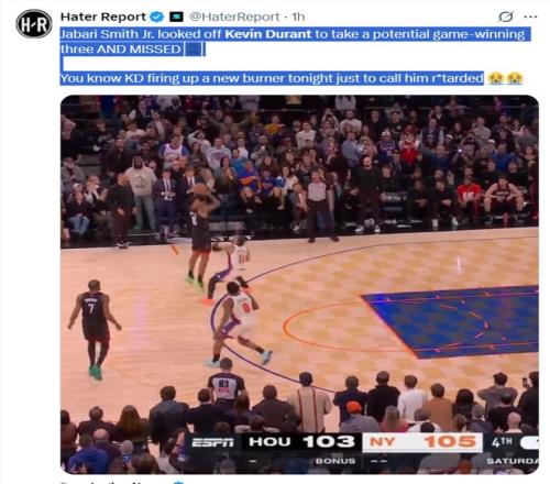 如果沒有看比賽,大家會認(rèn)為小賈巴里-史密斯、凱文-杜蘭特兩人在關(guān)鍵時刻一人投丟了一個關(guān)鍵球,但看了比賽的球迷就知道杜蘭特決勝時刻的表現(xiàn)堪稱戰(zhàn)犯。