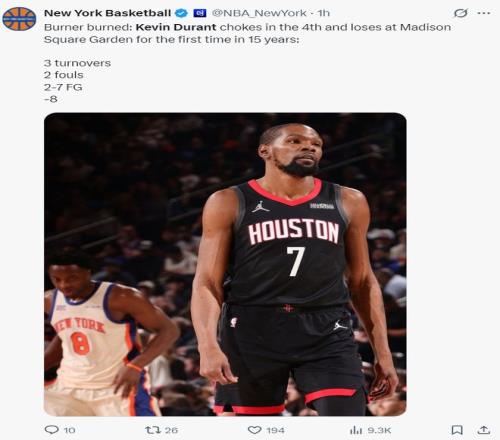 整個第四節(jié),杜蘭特都如同戰(zhàn)犯一般,7分鐘里,7中2,三分3中1,拿到5分1籃板3失誤2犯規(guī),正負(fù)值-8。 尼克斯媒體:KD在關(guān)鍵時刻掉鏈子,他在末節(jié)發(fā)揮失常,這是他在15年來首次在麥迪遜廣場花園球館輸球。