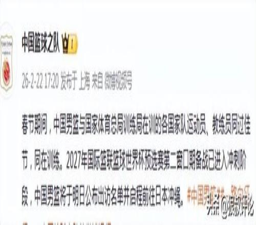 北京時間2月22日,根據(jù)中國籃協(xié)官方社媒發(fā)文,中國男籃經(jīng)過了長達2周多的封閉集訓后,首次曝光訓練照,高詩巖,胡金秋,曾凡博,程帥澎等球員上榜。 中國籃協(xié)官方發(fā)文如下: 春節(jié)期間,中國男籃與國家體育總局訓練局在訓的各國家隊運動員、教練員同過佳節(jié),同在訓練。2027年國際籃聯(lián)籃球世界杯預選賽第二窗口期備戰(zhàn)已進入沖刺階段,中國男籃將于明日公布出訪名單并啟程前往日本沖繩。 目前高達21人集訓名單,截止目前都沒有第一批淘汰球員讓外界感到意外,畢竟春節(jié)假期期間,這一批球員安排漫長的集訓,某種程度已經(jīng)是全心全意投入到備戰(zhàn)計劃,但最終只有12人具備踏上正式舞臺的資格。 球迷對于這一支中國男籃的期待非常之高。在籃協(xié)官方社媒的評論區(qū)送出祝福,期盼2場比賽都能大獲全勝。 中國男籃最新一期的集訓名單如下: 趙睿、曾凡博、廖三寧、趙繼偉、張鎮(zhèn)麟、李弘權、蔣浩然、龐崢麟、胡金秋、朱俊龍、程帥澎、高詩巖、徐杰、胡明軒、焦泊喬、徐昕、齊麟、趙嘉義、賀希寧、王浩然,外加留洋的余嘉豪。 中國男籃計劃于2月23日抵達日本沖繩進行最后的適應訓練。他們將于2月26日對陣日本隊,3月1日對陣中國臺北隊。 |