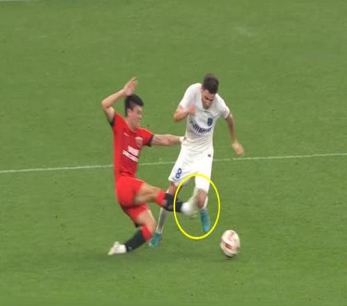 接著,魏震也在一次飛鏟中踹到對手的小腿(下圖),李海新照樣沒有任何表示,黃牌都沒有。難道是李海新的執(zhí)法風格寬松,少出牌?未必。