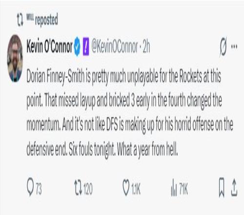 NBA記者凱文-奧康納質(zhì)疑烏度卡的用人:芬尼史密斯在火箭隊(duì)根本無(wú)法發(fā)揮應(yīng)有水準(zhǔn),第四節(jié)丟上籃、多次投丟空位三分還有低級(jí)失誤,他防守端的特點(diǎn)也沒(méi)有展現(xiàn)出來(lái),全場(chǎng)還吃下6次犯規(guī)。