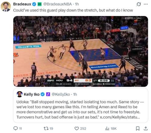 火箭2分惜敗尼克斯,而這場(chǎng)比賽火箭一度領(lǐng)先尼克斯達(dá)到18分之多,可在末節(jié)火箭18中5,命中率僅為27.8%且出現(xiàn)了9次失誤,他們幫助尼克斯打出33-15的攻防浪潮,尤其是最后5分鐘關(guān)鍵時(shí)刻球隊(duì)是接連出現(xiàn)低級(jí)的失誤,這場(chǎng)比賽引發(fā)了全美熱議。