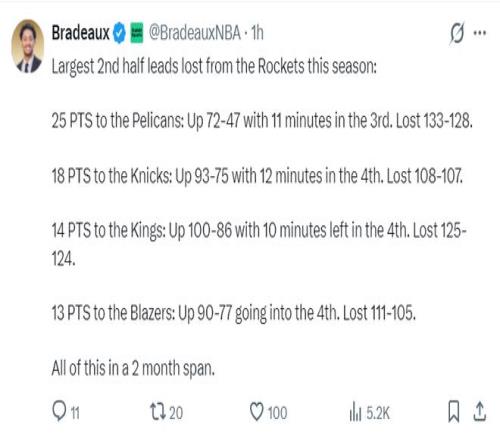 休媒曬出過(guò)去兩個(gè)月內(nèi),火箭隊(duì)已經(jīng)有四次下半場(chǎng)領(lǐng)先至少13分的情況下被逆轉(zhuǎn)了,最慘烈的一場(chǎng)是下半場(chǎng)領(lǐng)先鵜鶘25分卻被逆轉(zhuǎn)了。這場(chǎng)是領(lǐng)先尼克斯18分被逆轉(zhuǎn)。