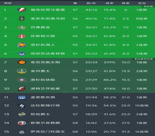 北京時(shí)間2月22日,這個(gè)比賽日的NBA常規(guī)賽結(jié)束了所有比賽,我們看看西部最新排名,主要的信息如下:馬刺139-122送國(guó)王16連敗,火箭106-108被尼克斯逆轉(zhuǎn),太陽(yáng)113-110絕殺魔術(shù),鵜鶘126-111戰(zhàn)勝76人,灰熊120-136不敵熱火!