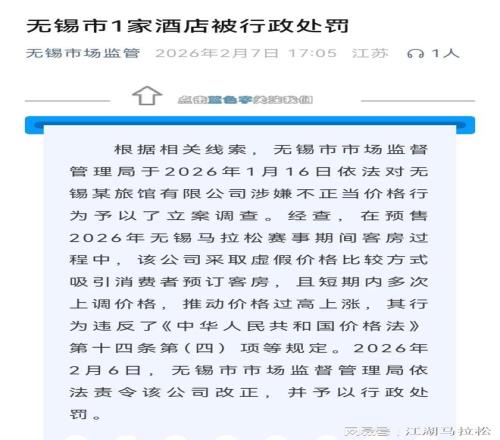 任性 上觀新聞在1月中旬就發(fā)過(guò)一篇文章,慨嘆中簽不易,住宿更難。例子選的是錫馬,位于黿頭渚風(fēng)景區(qū)的快捷酒店,平日150元的房,賽前一晚1140元。有一家四星級(jí)酒店,從五百出頭漲到兩千。 文章也算客觀,提到了幾家賽事沿線(xiàn)酒店賽前一晚房?jī)r(jià),與平日基本持平。終點(diǎn)的豪華酒店,比平時(shí)漲了三四百。 不管哪個(gè)城市,賽前都會(huì)有漲價(jià)的,但是略微漲一些,大家還是能夠接受的。像這種十倍二十倍的,有些典型和極端,極易被拿出來(lái)說(shuō)。 無(wú)錫市市場(chǎng)監(jiān)督管理局在1月16日對(duì)蠡湖之星旅館有限公司涉嫌在今年錫馬期間存在的賓館酒店價(jià)格不正當(dāng)行為進(jìn)行立案調(diào)查。