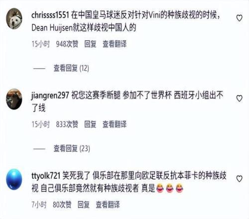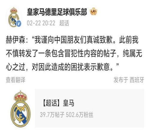 現(xiàn)如今,又是皇馬相關人士引發(fā)爭議,俱樂部方面依舊沒有像此前維尼修斯那樣做出正式的官方回應。 2月22日,皇馬官方微博超話發(fā)布一則消息,疑似為赫伊森進行道歉。但是,皇馬官網(wǎng)和赫伊森個人社媒并無相關內(nèi)容。 看了一下,顯然廣大球迷并不買賬! 「赫伊森自己知道嗎?」 「沒什么可說的,徹底脫團?!?/p> 「又是微博特供道歉?!?/p> 「這年頭誰還相信微博消息?!?/p>