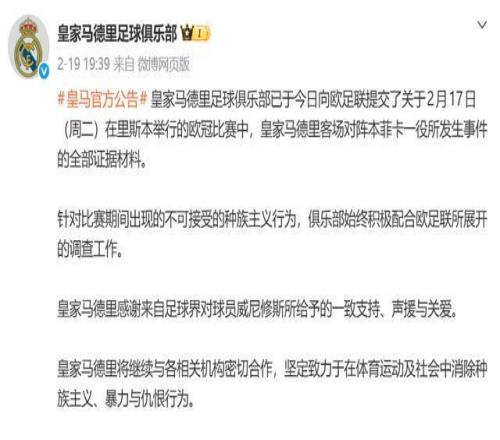 這事一出,瞬間成為足壇的一大熱點,其它聯(lián)賽的教練與球員也被記者問及對此的看法。 很快在2月19日,皇馬正式發(fā)布官方公告,表示俱樂部已向歐足聯(lián)提交了全部證據(jù)材料。 最后表示:堅定致力于體育運動及社會中消除種族歧視、暴力與仇恨行為。