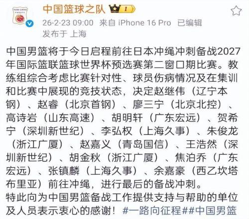 經(jīng)歷了一個(gè)春節(jié)假期之后,中國(guó)男籃迎來(lái)了世預(yù)賽關(guān)鍵的兩場(chǎng)比賽,特別是客場(chǎng)和日本男籃。最近中國(guó)男籃名單有很多傳聞,包括徐杰、曾凡博和徐昕受傷的消息。 就在中國(guó)男籃抵達(dá)上海轉(zhuǎn)機(jī)的時(shí)候,中國(guó)男籃官方正式公布了14人名單,其中高詩(shī)巖留隊(duì),第一階段表現(xiàn)出色的龐崢麟落選,另外包括曾凡博、徐昕、徐杰等人也因?yàn)閭‰x隊(duì),根據(jù)計(jì)劃,中國(guó)男籃會(huì)在比賽前確定12人名單。