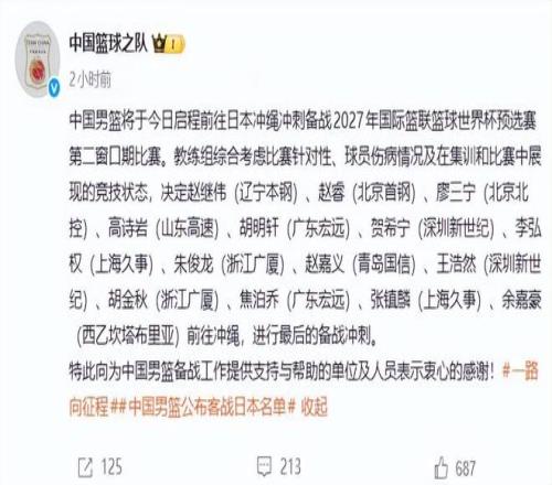 中國男籃確定世預(yù)賽對日14人名單,延用核心陣容