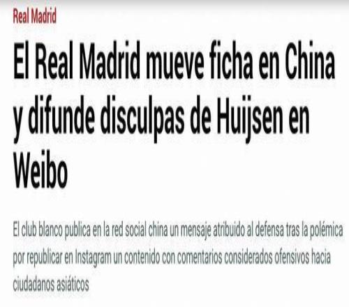 赫伊森在社交媒體轉(zhuǎn)發(fā)辱華內(nèi)容事件引發(fā)西班牙媒體關(guān)注,《阿斯報(bào)》《馬卡報(bào)》《世界體育報(bào)》等西班牙多家知名媒體均對(duì)此事進(jìn)行了報(bào)道。