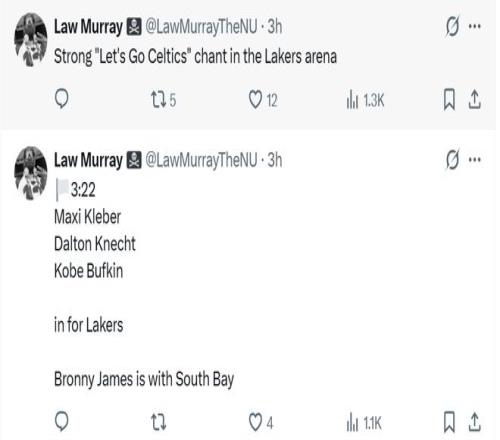 短板三:過(guò)分在意吹罰 在陣容本就存在問(wèn)題的情況下,湖人隊(duì)面對(duì)逆境時(shí)的心態(tài)與韌性也不如凱爾特人,全場(chǎng)太過(guò)在意裁判吹罰,每當(dāng)出現(xiàn)爭(zhēng)議吹罰時(shí),都能看到湖人球員的抱怨行為,沮喪與失落肉眼可見(jiàn)。 在末節(jié)比賽還沒(méi)有失去懸念的情況下,已經(jīng)有一些放棄的勢(shì)頭出現(xiàn),導(dǎo)致現(xiàn)場(chǎng)球迷極度不滿(mǎn)直接倒戈。 賽后記者Law Murray曝出,在比賽失去懸念后,湖人主場(chǎng)響起了“凱爾特人加油”的呼聲以表達(dá)對(duì)主隊(duì)表現(xiàn)的不滿(mǎn)。