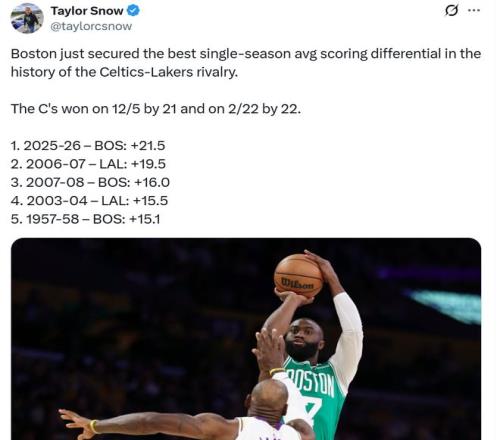 湖人兩戰(zhàn)輸43分 前一場(chǎng)洛杉磯德比戰(zhàn)擊敗快船后,湖人隊(duì)迎來(lái)與凱爾特人經(jīng)典的“黃綠大戰(zhàn)”,最終比賽早早呈現(xiàn)出一邊倒態(tài)勢(shì),湖人以89-111不敵凱爾特人遭后者賽季雙殺。 湖人隊(duì)不僅被凱爾特人隊(duì)常規(guī)賽雙殺橫掃, 兩場(chǎng)還一共輸?shù)?3分之多,場(chǎng)均凈輸21.5分創(chuàng)造凱湖單賽季場(chǎng)均勝分差新高。 要知道,凱爾特人核心塔圖姆一直缺席,本賽季開(kāi)始前又清理波神、霍勒迪、霍福德等一眾即戰(zhàn)力降薪,在這種情況下還能兩戰(zhàn)狂勝湖人43分也暴露出后者3大爭(zhēng)冠短板。