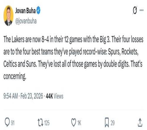 湖人媒體PurpGolded更是發(fā)文失望表示:“湖人這樣的表現(xiàn)很難突破首輪。”
