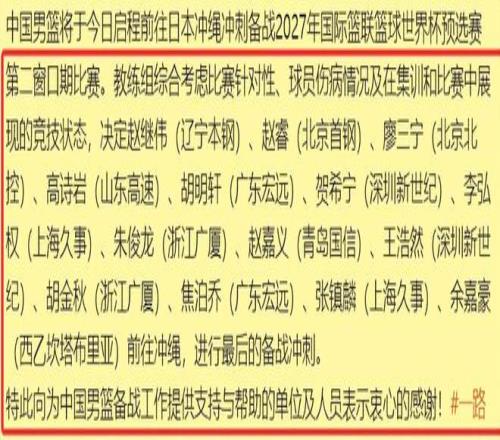 北京時(shí)間2月23日,是中國男籃出發(fā)前往日本的日子,與此同時(shí),中國男籃也正式官宣了入選此次世界杯預(yù)選賽的14人名單。分別是后衛(wèi)趙睿、趙繼偉、廖三寧、胡明軒和高詩巖;鋒線球員張鎮(zhèn)麟、朱俊龍、賀希寧、王浩然、李弘權(quán)和趙嘉義;內(nèi)線球員胡金秋、焦泊喬和余嘉豪。