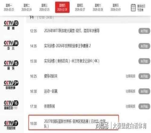 根據(jù)賽程顯示,世預賽中國男籃vs日本隊男籃的比賽將會在北京時間2月26日18點05分開打。 至于球迷關(guān)注的直播問題,根據(jù)央視體育頻道給出的節(jié)目單預告,將會直播本場生死大戰(zhàn)。 到底是3連敗or扳回一城? 讓我們拭目以待,中國男籃加油!