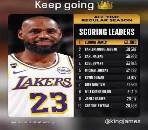 在2023年2月7日湖人對陣?yán)做谋荣愔?,他砍?8分,超越卡里姆-阿卜杜勒-賈巴爾,登上常規(guī)賽生涯得分榜榜首。詹姆斯在2025年12月30日年滿41歲,目前獨自一人高居歷史得分榜榜首。