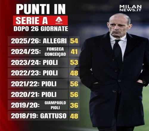 北京時(shí)間2月24日,米蘭新聞網(wǎng)統(tǒng)計(jì)出了AC米蘭近8個(gè)賽季意甲前26輪過后的成績,本賽季阿萊格里率隊(duì)拿到54分為近8個(gè)賽季的第二高積分。
