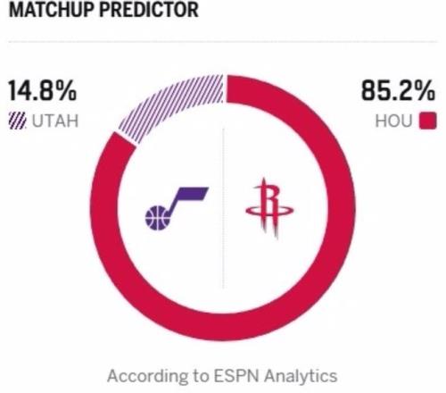 反觀爵士,目前戰(zhàn)績?yōu)?8勝39負(fù),本賽季爵士隊(duì)完成重磅交易,為補(bǔ)強(qiáng)防守實(shí)力引進(jìn)了前最佳防守球員小賈倫·杰克遜,加之本賽季狀態(tài)爆發(fā)的基昂特·喬治,球隊(duì)未來潛力不容小覷。但目前爵士隊(duì)遭遇嚴(yán)重傷病困擾,四大主力缺陣,陣容殘缺的他們在本賽季更多是想鍛煉隊(duì)伍,擺爛俯沖狀元簽,此役戰(zhàn)意不足!賽前,ESPN預(yù)測這場比賽,火箭贏球概率高達(dá)85.2%,爵士贏球概率只有14.8%。